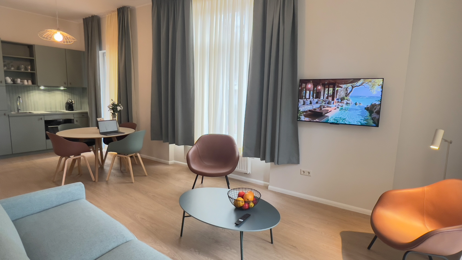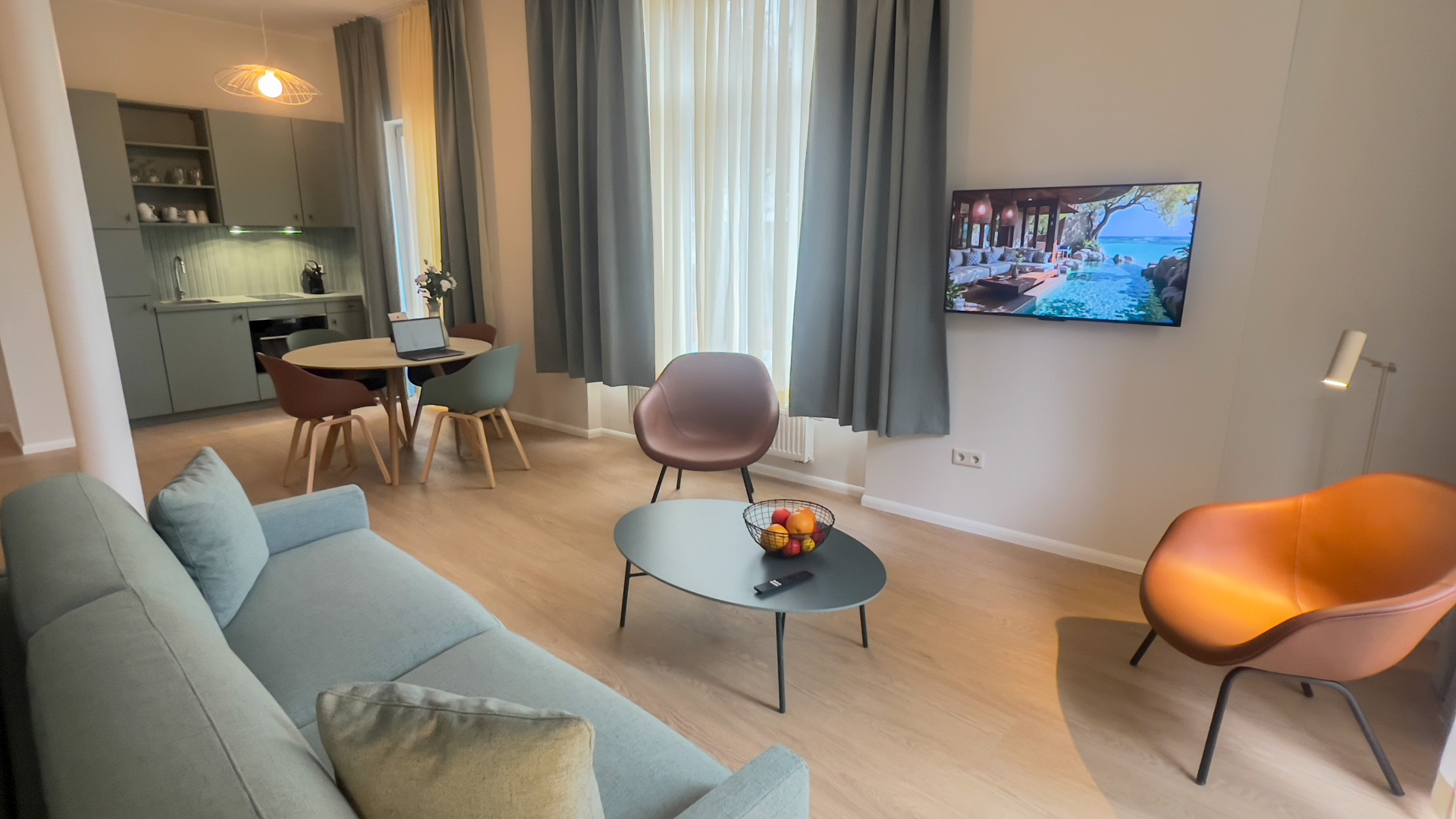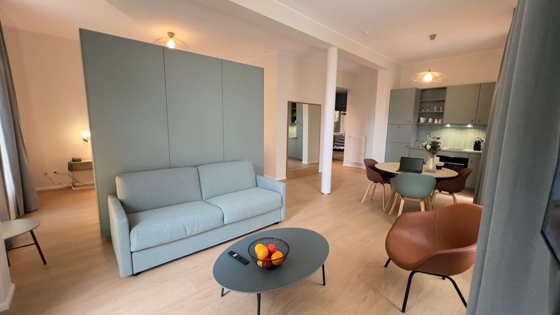 font 55 m2. Ces studios disposent d'un espace nuit séparé. Le reste de l’espace est en open space avec des zones spécifiques pour la détente, le travail et les repas. Une entrée et une salle de bains séparée avec WC, complète cet ensemble. Mis à part la zone de couchage séparée, ils disposent d'un équipement similaire à celui des studios Elegant avec toutefois un salon équipé d’un sofa convertible, ce qui permet d’accueillir 2 adultes et deux enfants. Les kitchenettes sont équipées de plaques vitrocéramiques, d'un micro-ondes, d'un lave-vaisselle, d’un congélateur intégré dans le frigidaire, de couverts et d’ustensiles de cuisine pour préparer et prendre vos repas mais aussi inviter des amis.