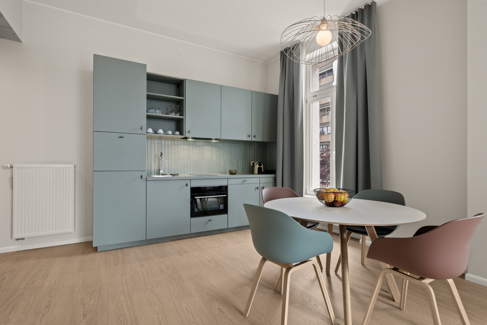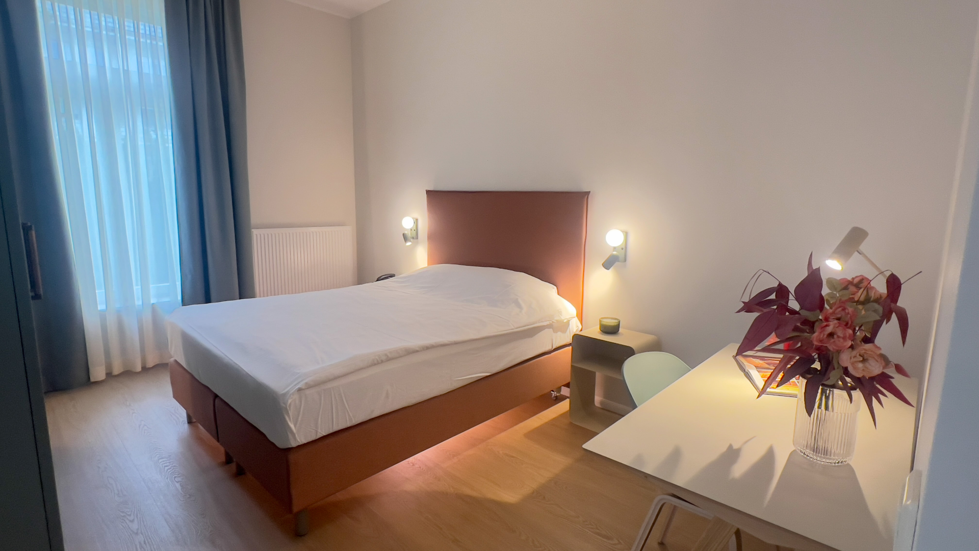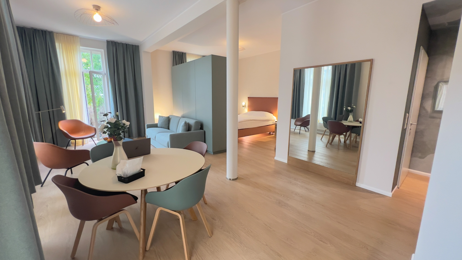 font 55 m2. Ces studios disposent d'un espace nuit séparé. Le reste de l’espace est en open space avec des zones spécifiques pour la détente, le travail et les repas. Une entrée et une salle de bains séparée avec WC, complète cet ensemble. Mis à part la zone de couchage séparée, ils disposent d'un équipement similaire à celui des studios Elegant avec toutefois un salon équipé d’un sofa convertible, ce qui permet d’accueillir 2 adultes et deux enfants. Les kitchenettes sont équipées de plaques vitrocéramiques, d'un micro-ondes, d'un lave-vaisselle, d’un congélateur intégré dans le frigidaire, de couverts et d’ustensiles de cuisine pour préparer et prendre vos repas mais aussi inviter des amis.